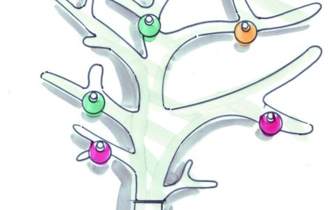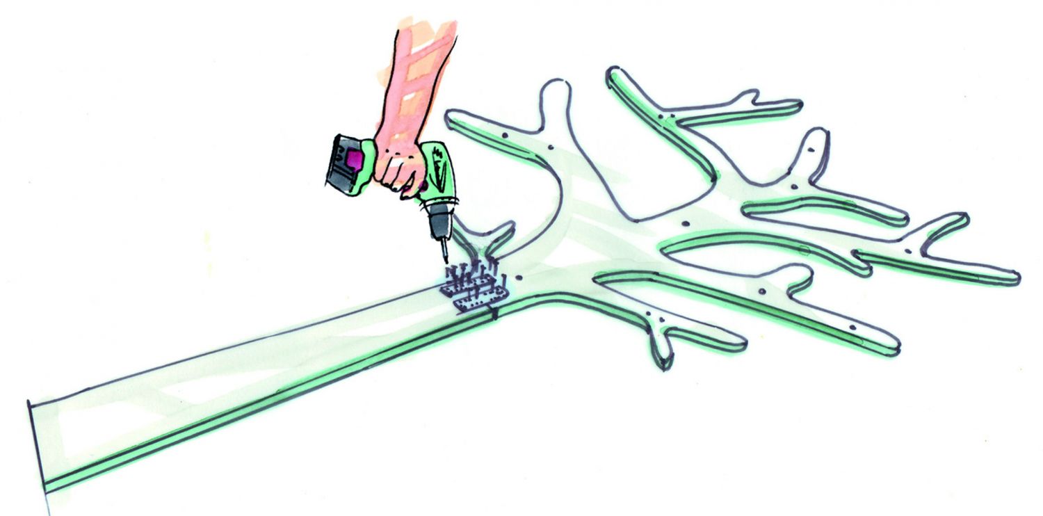 Nun den Baum an der Wand befestigen: Dafür den Baum ausrichten und durch die Löcher mit einem Steinbohrer in die Wand bohren. Den Baum von der Wand nehmen und die Löcher für die entsprechenden Dübel bohren. Dabei die Türstopper einfügen, sie dienen