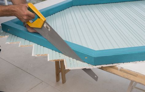 Die Bretter für den Giebel mit einer Handsäge angepassen. Loch für das Bullauge vorzeichnen und mit einer Stichsäge aussägen. Mit mindestens vier Schrauben werden die Seiten bündig mit der Außenkante auf den Boden geschraubt.