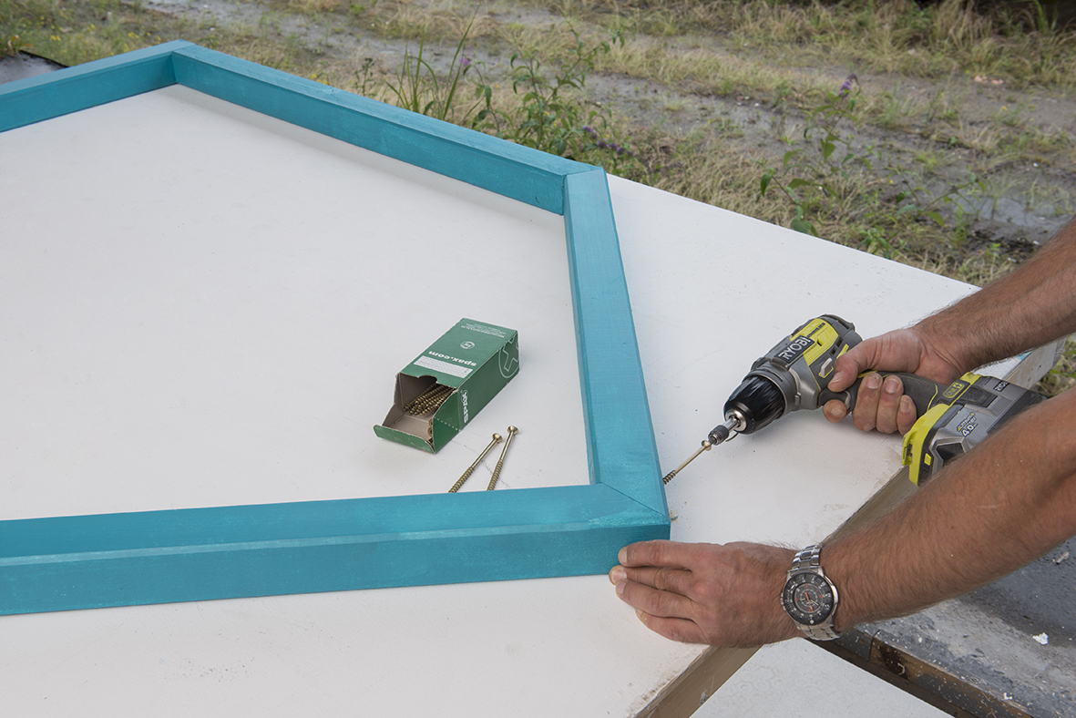 Jetzt die Rückwand mit je zwei Klammern pro Brett befestigen. Acrylplatte mit Silikon auf die Innenseite des Blendrahmens kleben und anschließend mindestens vier Schraublöcher für die Befestigung vorbohren. Den Blendrahmen anschrauben. HPL-Platten auf beiden Seiten an zwei Stellen vorbohren und befestigen. Die scharfkantigen Ecken mit dem Schleifgerät abrunden.