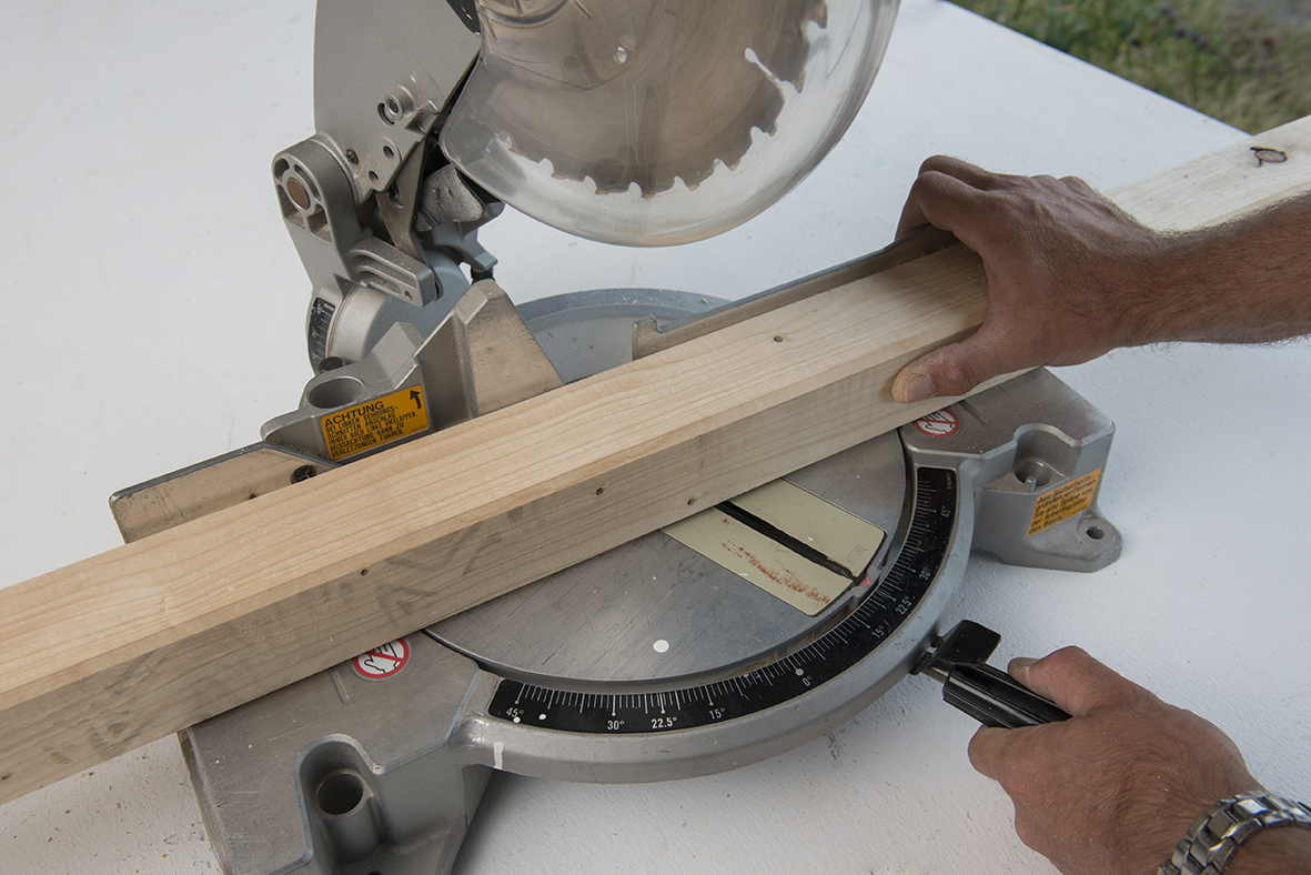 Die Beplankungsbretter und die Konstruktionsbalken mit der Kappsäge zuschneiden. Beim Zuschnitt der Konstruktionsbalken die Winkelschnitte beachten und auf der Kapp- und Gehrungssäge einstellen.