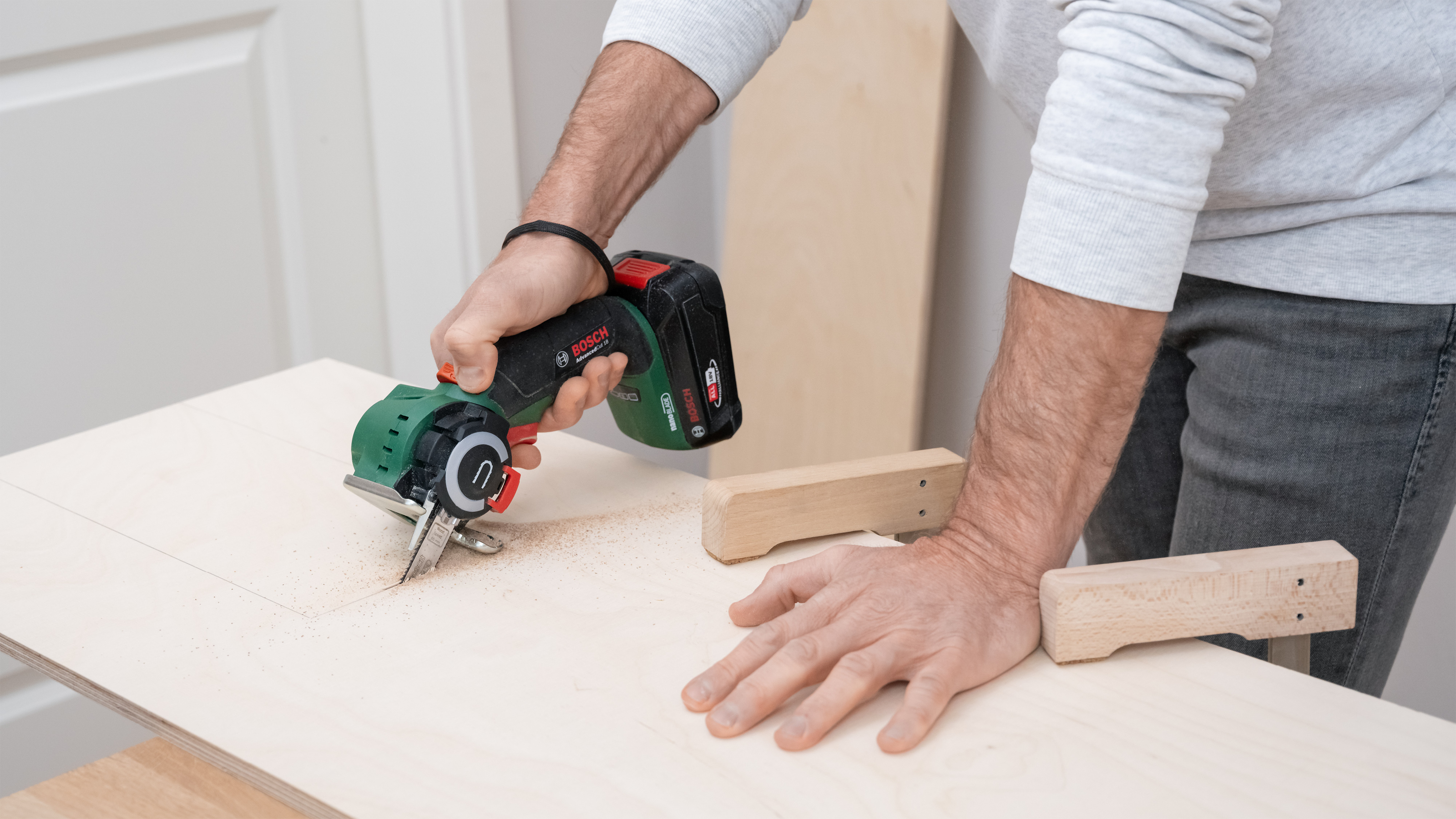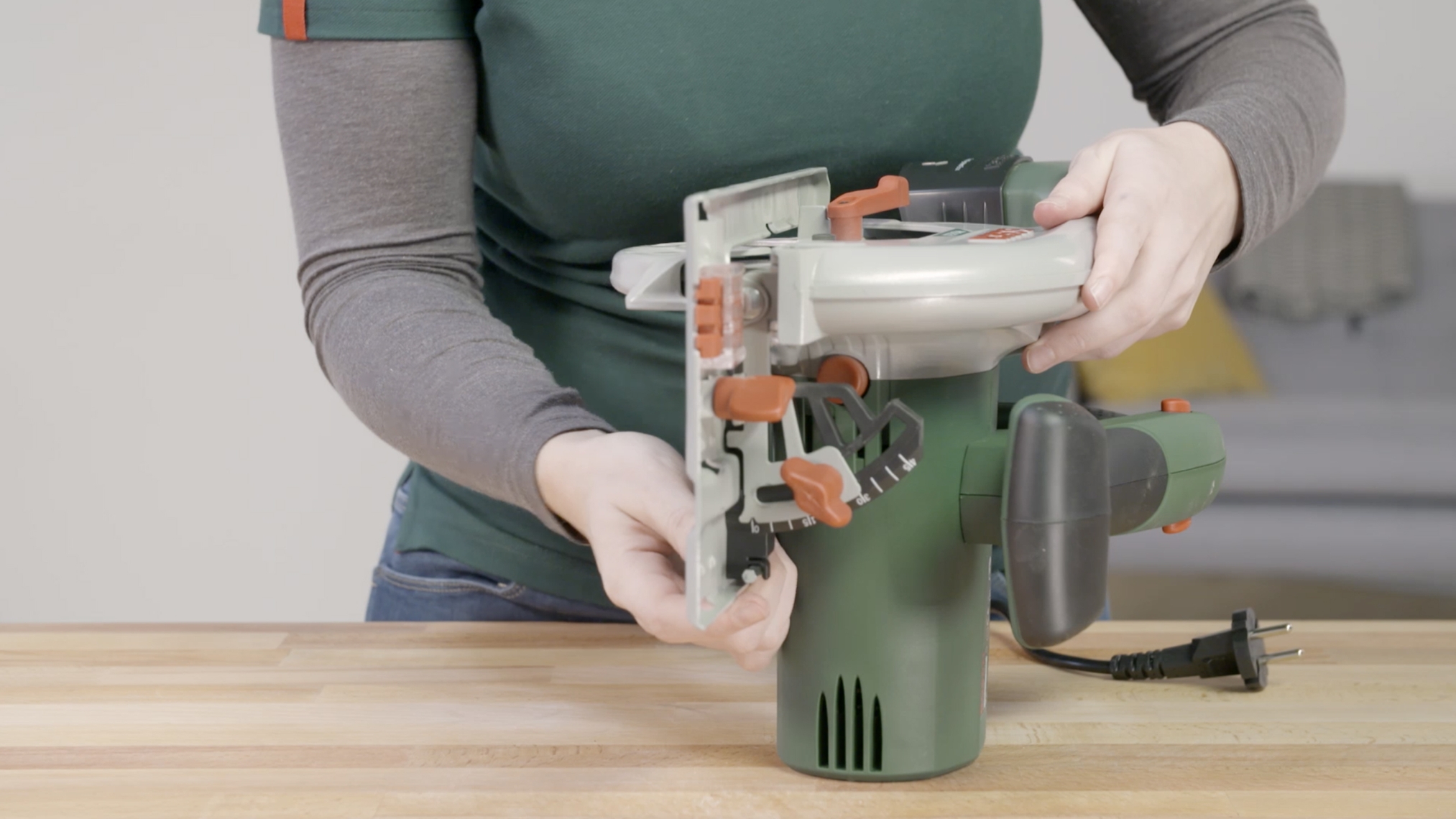 Die Säge mit beiden Händen gleichmäßig führen. Die Grundplatte satt aufsetzen, bzw. auf die Schiene drücken, damit die Säge nicht kippt.