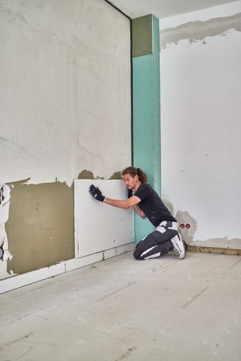 Solche kondensattolerierenden Systeme sind häufig Platten, die direkt an die Wand verklebt werden – mit zum System passendem kapillaraktivem Kleber. Wichtig ist, dass die Platten satt und vollflächig im Kleberbett liegen, es darf kein Luftraum dahinter verbleiben. Schwer zu dämmen sind Innenwände mit Vor- und Rücksprüngen. Flexible Plattenmaterialien gleichen diese zu einem gewissen Grad aus.