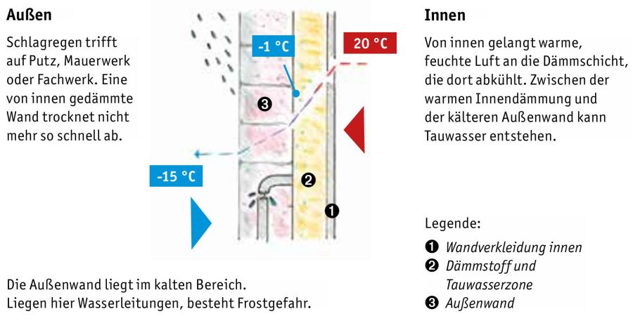 Kurz erklärt: Warme Luft kann mehr Feuchtigkeit aufnehmen als kalte. Die warme Raumluft kühlt in Richtung Außenwand ab, das Wasser kondensiert. Bei einer Innendämmung liegt diese „Tauwasserzone“ innerhalb der Dämmschicht (siehe Zeichnung unten): Es kann zu Feuchteschäden kommen.