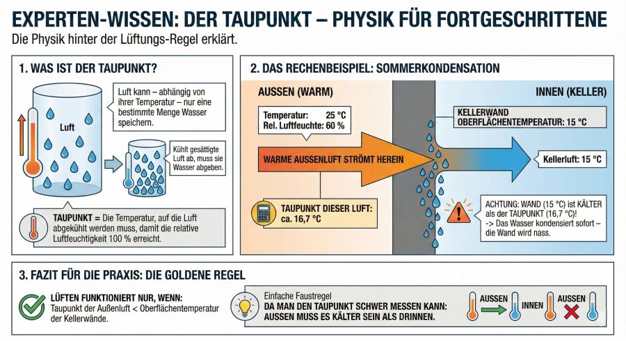 Fazit für die Praxis: Lüften funktioniert physikalisch nur, wenn der Taupunkt der Außenluft niedriger ist als die Oberflächentemperatur Ihrer Kellerwände. Da man den Taupunkt im Alltag schwer messen kann, bleibt die einfache Faustregel: Außen muss es kälter sein als drinnen.
