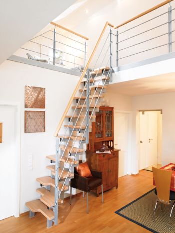 - Viertelgewendelte Treppen, Podesttreppen und Spindeltreppen sind ebenfalls Platz sparende Lösungen für die Verbindung der zwei Wohnebenen.
